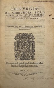 Édition originale de cet important recueil qui rassemble les plus importants écrits sur la chirurgie : Jean Tagault, Mariano Santo Angelo Bolognini, Michelangelo Biondo, Bartolomeo Maggi, Afonso Ferri, Johann Lange, Galien, Oribase, ainsi que des traités inédits. Cette réunion a été constituée par Comad Gessner. Aux pages 393-408, Gessner présente en courtes notices bio-bibliographiques une liste de 150 auteurs de littérature médicale.