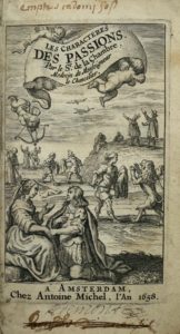 Joint, du même : Les Caractères des Passions. Amsterdam, A. Michel, 1658. In-16, vélin de l’époque. 12 ff., 599 pp. Belle impression elzévirienne qui contient les deux premières parties du texte : Les Charactères des passions et La Nature et effets des passions courageuses. Une troisième et une quatrième partie paraîtront en 1659 et une cinquième en 1662. Les Elzevier ont apporté un soin particulier à cette édition, s’agissant du livre du médecin de leur protecteur le chancelier Séguier. Cioranescu 22656 – Willems 1233.