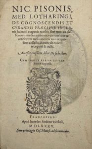 Seconde édition, la première est de Francfort 1580. C’est le grand ouvrage de Nicolas Le Pois (ou Piso) (1527-1587), natif de Nancy qui fut un des médecins les estimés de son temps. Après des études à Paris auprès de Sylvius, il succéda à son frère comme médecin du duc de Lorraine (Charles III). Il accorde une importance particulière au cognoscendis, la description des symptômes.