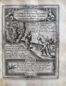 Manuscrit du cours du jésuite Jacques Lambert (1603-1670), professeur d’humanités. En tête de chaque partie, on trouve une gravure en frontispice, la première est une allégorie emblématique de Thomas de Leu titrée Speculum, sur le thème du chemin du bien et du mal. La seconde montre Saint Jacques à cheval, signée Le Clerc.