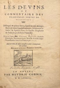 Édition originale de la traduction par Simon Goulart du Commentarius de praecipuis generibus divinationum publié à Wittenberg en 1560. Ce livre fameux répertorie toutes les sortes de divinations : aéromance, electryomance, aleuromance, astrologie, chiromance, génération des androgynes, et consacre des notices aux comètes, la création des bons et des mauvais anges, lycanthropie, magie, miracles, monstres, oracles, sibylles, et sorciers, etc.