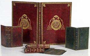 Parchemin ou vélin : 4 reliures + 4 plats.— Maroquin ou cuir vert : 5 reliures dont 1 fleuronnée du début XIXe s.— Missels (ou ouvr. religieux) liégeois ou allemands en cuir, avec coupes, décor et fermoirs en métal : 4 reliures dont 1 in-4°.— Maroquin ou cuir rouge : 5 reliures dont 1 in-4° aux armes épiscopales de la famille de Rohan, 1 in-12° dans le style de Bozérian, 2 du XVIIIe s. avec jolies roul. dorées + 2 plats (style fanfare aux petits fers et plat sup. de chemise fleuronné au début XIXe s., avec fermoir, mais abïmée et salie).— Veau : 4 reliures dont 1 in-16° aux petits fers, 1 in-4° joliment fleuronnée du XVIIIe s. et 1 in-4° avec quadrillage à froid et roul. dorées signée "S. & I. Fuller" + 1 portefeuille (?) fleuronné du XVIIIe s. et 2 armoiries découpées dans des plats (une de la famille Gonzague ?).— Cuir noir : 2 reliures dont 1 aux petits fers.