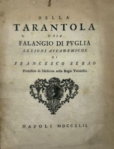 SERAO (Francesco) — Della tarantola o sia falangio di Puglia lezioni accademiche.