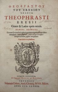 THÉOPHRASTE — Græce et Latine, Opera omnia. Daniel Heinsius textum Græcum locis infinitis partim ex ingenio, partim e libris emendavit ; hiulca supplevit, male concepta recensuit ; interpretationem passim interpolavit. Cum indice locupletissimo.