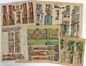 Grands sujets destinés à des fonds de décors (jardins, mosquée...) et du mobilier à découper.