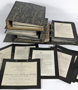 (Imagerie) - +/- 2.300 faire-part de décès de grandes familles, principalement belges. 1819-1984. Majoritairement in-4° et en français, plusieurs sur doubles pages, rares oblitérés, qqs doubles, classement alphabétique et en général par...