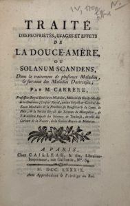 WEPFER (Joh. Jacob). Cicutae aquaticae historia et noxia. Bâle, König, s. d. (1679). 4 planches sur bois dans le texte. – FORMI (P.) Traité de l'adianton ou cheveu de Vénus... sur ,l'imprimé de 1644 à Montpellier, S.l. n. d. (XVI's.) Seconde partie seule. in-12, veau usagé – STORCK (A.) Dissertation sur l'usage de la cigüe... Paris, Valleyre, 1700, in-12, veau de l'ép. – FÉE (A. L. A.) Essai sur les cryptogames des écorces exotiques officinales... Firmin-Didot, 1824 ; in-4, demi-veau, charnières fendues – 34 planches coloriées – DUNAL (M. F.) Histoire naturelle, médicale et économique Les solanum... Paris , Strasbourg, Montpellier, 1813 ; in-4, cart. moderne. 26 planches dépl. – DECAISNE. Recherche anatomiques et physiologiques sur la garance. S.l.n.d. (1837) 10 planches. – PELLETIER et CAVENTOU, Analyse chimique des quinquina ... Paris, Colas, 1821 ; in-8, cart. mod. Envoi autographe – BRIQUET (P.) Traité thérapeutique du quinquina et de ses préparations. Deuxième édit. Paris, Masson, 1855 ; in-8 demi-chagrin de l'ép. – CADET (C.L.) Le thé est-il plus nuisible qu'utile? ou histoire analytique de cette plante. Colas, Delannoy, 1808 ; pet. in-8, veau époque abîmé. Relié à la suite: Dissertation sur le café par A. A. Cadet de Vaux. Paris, 1806 – Raisons d'un bon choix ou théorie des élections de 1797. – CARRERE. Traité des propriétés, usages et effets de la douce-amère ou solanum scandens. Paris, Cailleau, 1789 in-8 broché, non rogné.