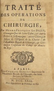 LE DRAN (H. Fr.) Traité des opérations de chirurgie... Paris, Osmont, 1742 ; in-8 – PETIT (J. L.) Traité des maladies chirurgicales et des opérations qui leur conviennent. Paris, Didot, 1774 ; 3 volumes in-8. Petits accidents aux reliures, intérieur frais, complet des 90 planches, portrait. – MORAND. Opuscules de chirurgie. Paris, Desprez, 1767-68 ; in-4 ; 2 parties en 1 volume. – [QUESNAY (Fr.)]. Histoire de l’origine et des progrès de la chirurgie en France. Paris, Brocas, 1749 ; in-4. Dos refait. – MAUQUEST DE LA MOTTE. Traité complet de chirurgie... Troisième édition. Paris, d’Houry, 1771 ; 2 vol. in-8.