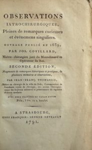COVILLARD (J.). Observations iatrochirurgiques pleines de remarques curieuses et événements singuliers, ouvrage publié en 1639. Seconde édition augmentée... par J.F. Thomassin. Strasbourg 1791 ; in-8, demi-basane récente, non rogné. 2 planches dépliantes.