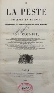 Joint : CLOT-BEY. De la peste observée en Égypte. Recherches et considérations sur cette maladie. Paris, Fortin, Masson..., 1840. in-8, demi-veau de l'époque. 2 ff., XXIV pp., 439 pp. – Édition originale avec 2 planches hors-texte coloriées (costumes de chirurgie et médecin en quarantaine au lazaret de Marseille en 1790 et 1819). Reliure épidermée aux coiffes et charnières.