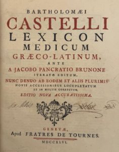 ELOY (N. F. J.) Dictionnaire historique de la médecine ancienne et moderne. Mons, Hoyois, 1778 ; 4 volumes in-4, demi-reliure usagée de l’époque. – CASTELLI (B.) Lexicon medicum graeco-latinum... Genève, de Tournes, 1746 ; in-4, veau de l’époque, armes royales sur le 1er plat, armes de l’université de Besançon sur le 2e. – ALBERT (Michel). Tentamen lexici realis observationum medicarum... Halle, 1727 ; 2 vol. in-4, veau brun, dos ornés. (Reliures de l’époque). – LEMERY (N.) Dictionnaire universel des drogues simples. Paris, d’Houry, 1759 ; in-4, veau brun de l’époque. Portrait, exemplaire usagé. – [GARSAULT.] Dictionnaire raisonné universel de matière médicale. Paris, Didot, 1773 ; 4 vol. in-8, veau de l’époque. – [VANDERMONDE (C. A.)] Dictionnaire portatif de santé... cinquième édition revue... Paris, Barbou, 1777 ; 2 volumes in-8, veau de l’époque.