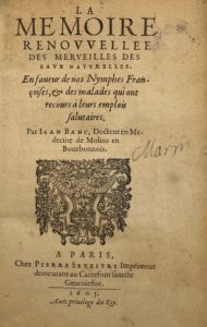 1) BANC (Jean). La Mémoire renouvelée des Merveilles des Eaux Naturelles. En faveur de nos Nymphes Françoises et des malades qui ont recours à leurs emplois salutaires. Paris, Sevestre, 1605 ; pet. in-8 vélin de l'époque. 12 ff., 140 ff. chiffrés. Édition originale Krivatsy 629.