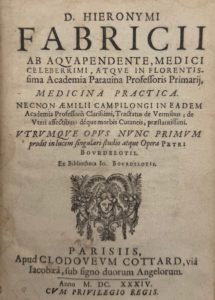 [FABRIZI D'AQUAPENDENTE (Girolamo)]. FABRICIUS (Hieronymus) — Medicina practica. Necnon Aemilii Campilongi... tractatus de vermibus ; de uteri affectibus ; deque morbis cutaneis... Utrumque opus nunc primum prodit in lucem singulari studio atque opera Petri Bourdelotii...