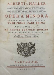 - Opera minora emendata, aucta, et renovata. Lausanne, Grasset, 1767-68 ; 3 vol. in-4, veau fauve, dos ornés, tr. rouges. (Rel. de l’époque). 34 pl. hors-texte d’anatomie, nombr. dépl. – Blake 196.