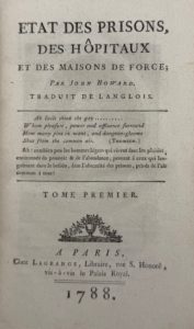 Première édition française de The State of the Prisons in England and Wales (...) containing a farther account of Foreign Prisons and Hospitals. L’ouvrage traite de l’état des prisons, maisons de correction et hôpitaux dans les différents comtés d’Angleterre, en Écosse, Pays de Galles, Irlande, États-Unis, Allemagne, Espagne, France, Portugal, etc.