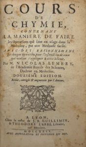 L'ouvrage de Lemery (Rouen 1645 – Paris 1715) a paru pour la première fois en 1675 et fut constamment réédité de son vivant et après sa mort. Il a longtemps servi de codex pour les pharmaciens. « Le cours de chimie de Nicola Lemery est l'aboutissement d'un genre littéraire dit « des cours de chimie » qui s'est développé en France dans le camp des apothicaires paracelsiens conciliants, à partir du premier cours de chimie le Tyrocinium chymicum en 1610 de Jean Béguin et s'est poursuivi par une dizaine d'oeuvres jusqu'à celle de Lemery». H. Metzger. Les doctrines chimique, en France du début du 17e à la fin du 18e s. Blanchard, 1969 , Coiffes usées.