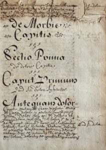 In-8, vélin souple (Reliure de l'époque).De morbis capitis. 151 feuillets recto-verso. Traité divisé en 17 parties traitant de mélancolie, apoplexie, folie, etc. – Un traité sur les maux de tête en 9 chapitres. 81 ff. recto-verso. – Tractatus de morbis thoracis. Par un certain Gaspar de Périgueux. En 3 parties. 34 ff. – Tractatus therapeuticus de morbis thoracis... par Sylvius (chanoine docteur). 49 ff.