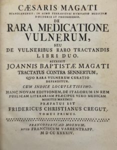 MAGATI (Cesare) — De rara medicatione vulnerum, seu de Vulneribus raro tractandis libri duo ... Hanc novam editionem ... praefatus est Fridericus Christianus Cregut.
