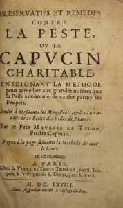 3) MAURICE de TOULON. Préservatifs et remèdes contre la peste, ou le Capucin charitable... Paris, Veuve Thierry, 1668 ; in-12, veau ancien usagé -12 ff., 407 pp., (1p.) Remise en vente de l'édit. orig. avec un titre modifié.