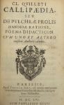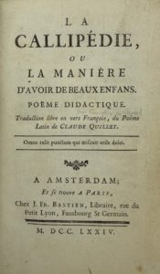 1) Callipaedia, seu de pulchrae prolis habendae ratione, poema didacticon. Paris, Joly, 1656 ; pet. in-8, veau fauve encadr. fil. dor., chiffre dor. sur les plats et au dos, tr. rouge. (Rel. du XVIIIe). Deuxième édition