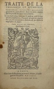 - HOUEL (Nicolas). Traité de la thériaque et mithridat, contenant plusieurs questions générales & particulières. Avec un entier examen des simples medicamens qui y entrent, le tout divisé en deux livres... Paris, Jean de Bordeaux, 1573 ; in-8, vélin de l’époque. 12 ff. n. ch., 149 (1) pp., 2 ff. n. ch. Édition originale de ce traité complet sur l’antidote le plus fameux de la pharmacopée de l’époque. Nicolas Houel (1520 – 1584) engagea la pharmacologie dans la voie scientifique en créant en 1576 un enseignement dans l’art de l’”apothicairerie”.