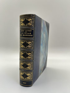 complet de la suite en noir et blanc sur papier de Chine, dont chacune des planches est signée. Complet des “pages specimen” reliées à la suite servant à la souscription. Reliure in-8 demi maroquin marron à coins, dos à 5 nerfs, orné de fers ors, lettrines or et date en pied, tête dorée, étui, couvertures et dos conservés, reliure signée Devauchelle.