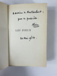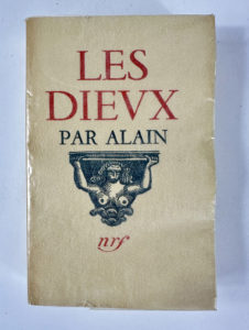 ALAIN : Les dieux. NRD Paris 1934. Édition originale. Tirage limité à 5885 sur vélin simili cuve, un des 385 hors commerce. Envoi autographe signé “à Monsieur de Montherlant, pour sa pentecôte” daté du 20 mai 1934. Broché in-12, dos...