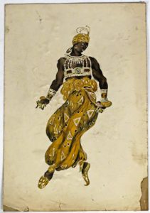 "Shéhérazade" de Diaghilev (Paris, 1910). Aquarelle originale, champ : 28 x 13,5 cm, sur papier blanc (36 x 25 cm), non signée, collée en plein sur carton (boursouflures, lég. salissures, qqs plis et qqs manques au bord inf. n'entamant que peu ou pas la composition).