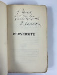 Francis CARCO : Perversité. J. Ferenczi et fils éditeur Paris 1925. Édition originale sur papier Alfa. Envoi autographe signé “à Jacques Kessel avec ma bien grande sympathie”. Broché in-12, couverture débrochée, dos déchiré sans manque,...