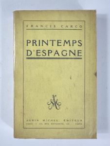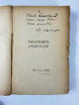 Francis CARCO : Printemps d'Espagne. Albin Michel éditeur Paris 1929. Edition originale en Service de presse. Envoi autographe signé à “Paul Léautaud avec ma très vive amitié”. Broché in-12, intérieur frais.