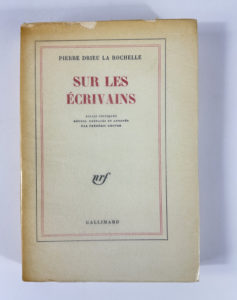 Pierre DRIEU LA ROCHELLE : Sur les écrivains. Essais critiques réunins, préfacé et annotés par Frédéric Grover. Gallimard Paris 1964. Édition originale. L'un des 41 ex. sur Pur fil, seul grand papier, celui-ci n°20. Broché in-8.