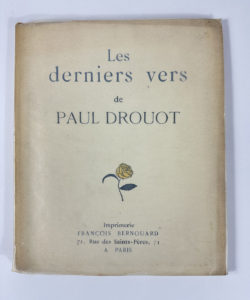[Paul DROUOT] Les derniers vers de Paul Drouot Imprimerie François Bernouard Paris 1920. Edition originale. Tirage limité à 305 ex., celui-ci l'un des 300 sur Arches, deuxième papier après 5 Japon. Broché in-8, dos jauni et aveugle. Peu courant.