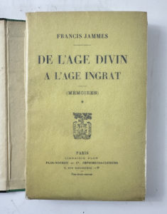 Francis JAMMES : De l'âge divin à l'âge ingrat. Mémoires. Plon Paris 1921. Édition originale, sans grand papier annoncé. Envoi autographe signé “à Valery Larbaud amical hommage”. Photo de Jammes, âgé se promenant avec son chien, contre...
