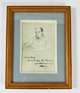 Valery LARBAUD : Gravure de son portrait par Paul-Emile Bécat. Envoi autographe “à ma tante Jeanne Bureau des Etivaux affectueusement” signé “Valery”. 9x13 cm, cadre 16,5x20,5 cm.