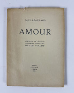Paul LÉAUTAUD : Amour Editions Spirale Paris 1934. Édition originale. L'un des ex. sur vélin Royal de Vidalon, celui-ci n°57, troisième papier. Complet du portrait de l'auteur par Edouard Vuillard. Truffé d'une lettre autographe signée du 14...