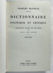 Charles MAURRAS : Dictionnaire politique et critique. Cahiers Charles Maurras Paris s.d.(1932-1934) Édition originale. Complément établi par les soins de Jean Pelissien. Quatre volumes reliés in-4 demi toile beige, pièce de titre sur cuir noir,...