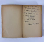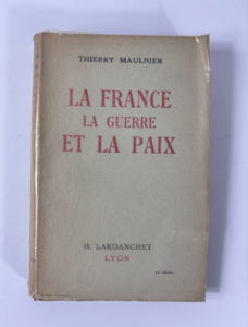 Thierry MAULNIER : La France, la guerre et la paix. Lardanchet éditeur Lyon 1942 (8 juin). Année de l'original, mention d'édition. Envoi autographe signé adressé “pour Paul Beauvais cette dédicace promise contre un ticket de fromage, en...