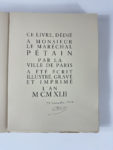 Maréchal Philippe PÉTAIN : Paris au Maréchal Paris 1942, imprimé sur les presses de l'école Estienne. Tirage limité à 200 ex., celui-ci l'un des 117 ex. sur vélin teinté d'Arches, n°84, troisième papier. Daté et signé “18 novembre 1942...