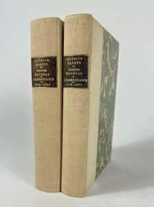 Philippide sur la morale de Barrès”, manuscrit de 3 pages in-8 d'Henri Massis. 6 lettres autographes signées de Barrès, dont 5 à Maurras qui ne figurent pas dans ce livre, “j'ai ce soir un dîner qui s'appelle Balzac et qui est fait de Zola, Bourget, France, xxx [nom non identifié], les Daudet et moi. Sept. Cela répond bien à mes goûts profonds. Et je me dis : n'y a t il pas les clients d'un dîner nationaliste ?”, une lettre autographe signée de Maurras à Barres Le second (la numérotation reprend p360) truffé de 11 lettres autographes de Barres, une liste autographe des académiciens avec notifié leur vote en faveur de Maurras ou non, deux lettres autographes signées de Kleber Haedens à Paul Beauvais, assurant qu'il lit cette correspondance. Ensemble relié en deux volumes, chacun in-8 demi toile à la bradel beige, dos lisse, pièce de titre sur cuir marron, lettrines or, relié sans les couvertures, reliure signée Gauché.