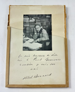 Abel BONNARD : Portrait en noir et blanc, imprimé sur papier d'Arches. Envoi autographe signé “Je suis heureux de dire ici à Paul Beauvais combien je suis son ami”. 16x23 cm, sous verre brisé avec manque.