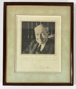 Pierre GAXOTTE : Photo en noir et blanc contre collée et encadrée, légendée et signée par l'auteur “Quelle drôle d'idée de garder une photo aussi laide ... Je ne connais pas ce croulant”. 13,5x17 cm sans la marie-louise, cadre de 20x24,2 cm.