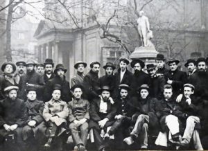 Rarissime photo de groupe de sculpteurs et peintres belges (dont Rik Wouters) prise devant l'Académie d'Anvers. [Avant 1916]. 13 x 14,8 cm (bords latéraux de la photo cachés sous le passe-partout). Sous passe-partout de velours rouge (râpé), cadre de bois mouluré (désencadrée, sans vitre).
