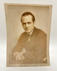 CHARDONNE Jacques : Très belle photo argentique datée du 12 novembre 1932 et réalisée par le grand studio photographique, G.L MANUEL frères. Portrait sépia de l'écrivain assis35x47 cm. Photo peu commune où l'écrivain esquive un très léger sourire