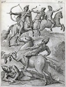 des Perses, des Scythes, des Amazones, des Parthes, des Daces, des Sarmates & autres peuples tant orientaux qu'occidentaux, &c. Nouvelle édition rédigée par M. Cochin. Paris, Alexandre Jombert, 1784 [- 1786]. 4 vol. in-4° : [4]-32, [2]-40, [4]-40, [2]-40 pp.; 351 (sur 352) h.-t. (ex. non rogné, qqs salissures et rouss., qqs déchirures marginales, t. II : manque la partie inf. de la pl. 1, mouill. aux 20 premières pl., pl. 25-30 reliées après la pl. 54, pl. 90 et 94 déchirées, incomplet de la pl. 96 selon Colas; t. III : déchirure pl. 65). Rel. courante de l'époque : bradel plein papier marbré brun (coins, coupes, coiffes émoussés, plats +/-frottés).