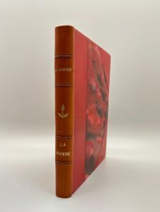 LA VARENDE Jean de : La Phoebé. Société Normande du livre illustré Rouen 1968. Première édition illustrée par Michel KING. L'un des 125 ex. sur Rives, seul tirage. Exemplaire nominatif. Complet du menu de l'Association pour la remise de ce livre. Ensemble relié in-4 demi maroquin rouge à coins, dos à 4 nerfs orné d'une encre de marine or, dos légèrement éclairci, charnières légèrement marquées, tête dorée, couvertures conservées, étui