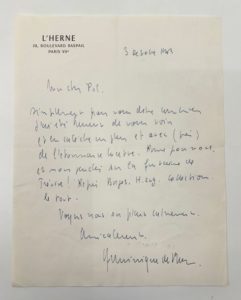 ROUX Dominique de : Correspondance avec Pol Vandromme. Ensemble de 22 lettres manuscrites ou tapuscrites. Il évoque CELINE, ses travaux de l'Herne et les collaborations de Vandromme aux Cahiers de l'Herne, le remercie pour les critiques élogieuses sur ses livres et ses nombreux voyages et aventures en Afrique