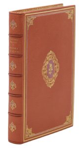 Paris, Alphonse Lemerre, 1873. In-12, maroquin rose, filet doré et listel de box parme en encadrement avec fleurons aux angles, médaillon doré et mosaïqué de box parme au centre, dos orné de fleurons dorés et mosaïqués de même, filets sur les coupes, dentelle intérieure, doublure et gardes de soie rose, doubles gardes, tranches dorées sur témoins, couverture et dos, chemise et étui gainés de maroquin gris (J. Faki – L. & C. Berthaux doreur).Édition originale.