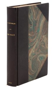 On joint, du même : Certains. Paris, Tresse & Stock, 1889. In-12, bradel demi-maroquin havane avec coins, non rogné, couverture et dos (Stroobants). Édition originale. Exemplaire enrichi d'une épreuve sur chine du portrait de Huysmans par L.-F. Bescherer sur laquelle figure un envoi autographe signé de l'écrivain à Gustave Coquiot. Petites rousseurs sur le portrait.