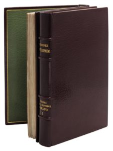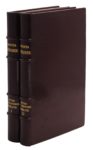 Paris, Victor Magen, 1844. 2 volumes in-8, maroquin prune janséniste, doublures de maroquin vert encadrées d’un filet doré, gardes de moire verte, doubles gardes, non rogné, couverture et dos, chemises et étuis gainés de maroquin fauve (Canape).Édition en grande partie originale.