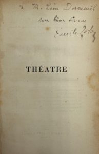Paris, Charpentier, 1878. In-12, demi-chagrin havane, chiffre LCD au dos (Reliure de l'époque).Première édition collective des trois premières pièces de théâtre d'Émile Zola, renfermant Le Bouton de rose, sans doute son plus grand four, en édition originale. Zola délégua par la suite l'adaptation de ses romans au théâtre.